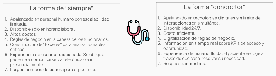 En este sentido, el cambio de enfoque hacia la escalabilidad, disponibilidad y experiencia se presenta como una necesidad imperante en la mejora continua de la atención médica. Buscamos transformar la forma en que los pacientes acceden a los servicios de salud, brindando mayores beneficios tanto para los pacientes como para los profesionales de la salud.