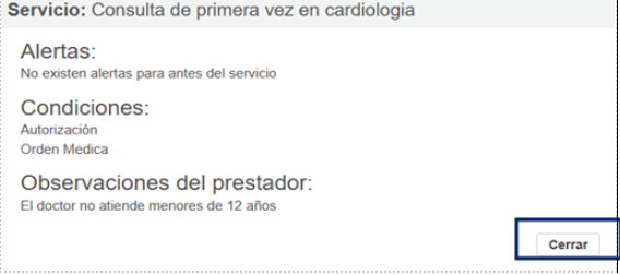 Informa al paciente sobre alertas, preparaciones y condiciones antes de cerrar la ventana. (Ver Imagen 17)