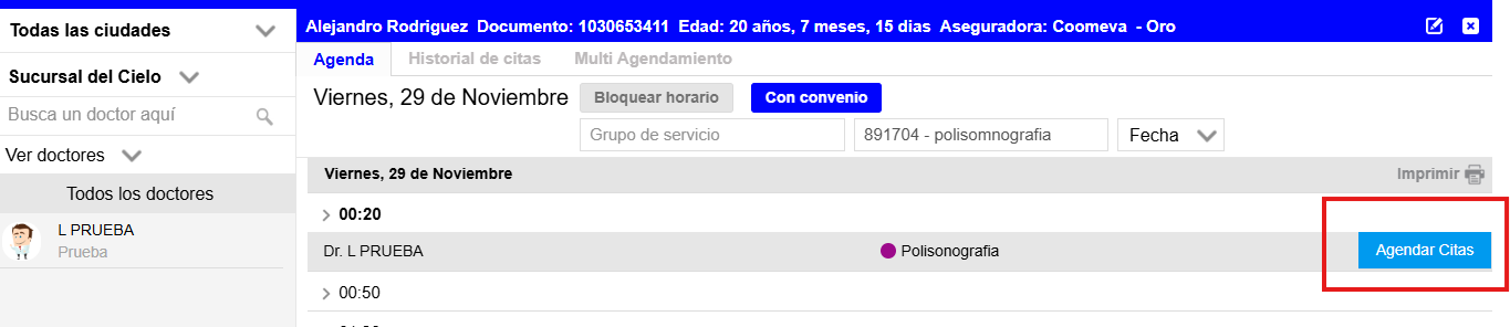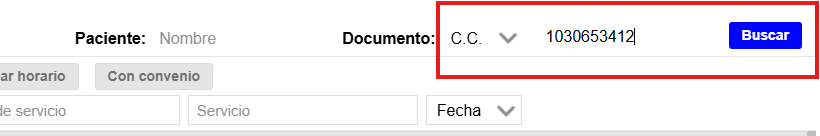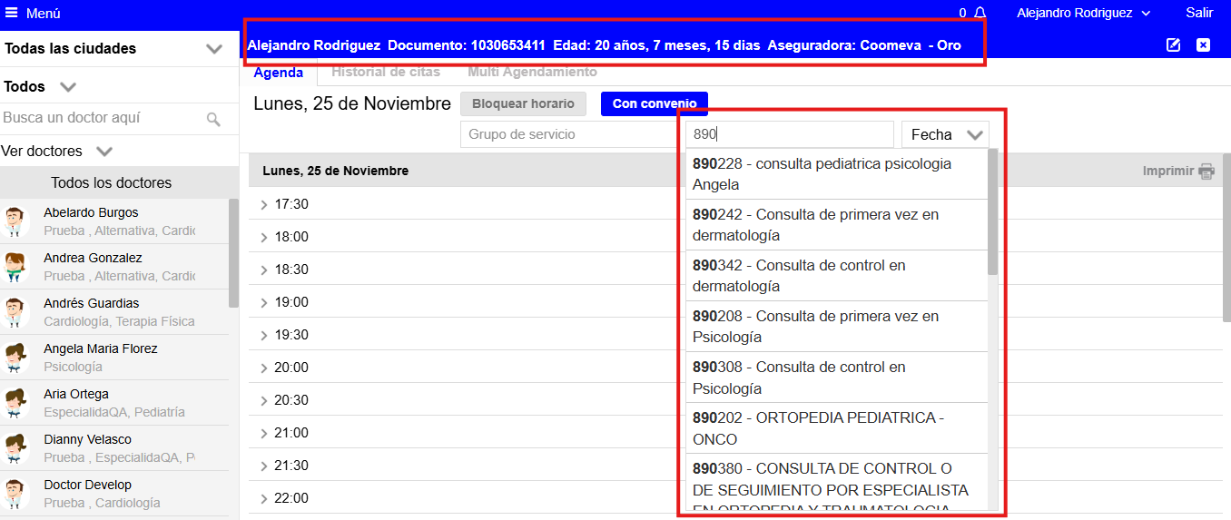 Confirma la información del paciente (nombre, número de documento, aseguradora) y selecciona el servicio a agendar. (Ver Imagen 6)
