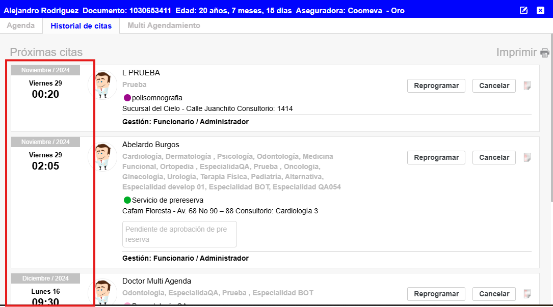 El sistema redirigirá al historial de citas, donde se podrán validar, reprogramar o cancelar citas. (Ver Imagen 18)