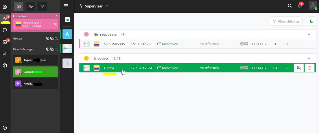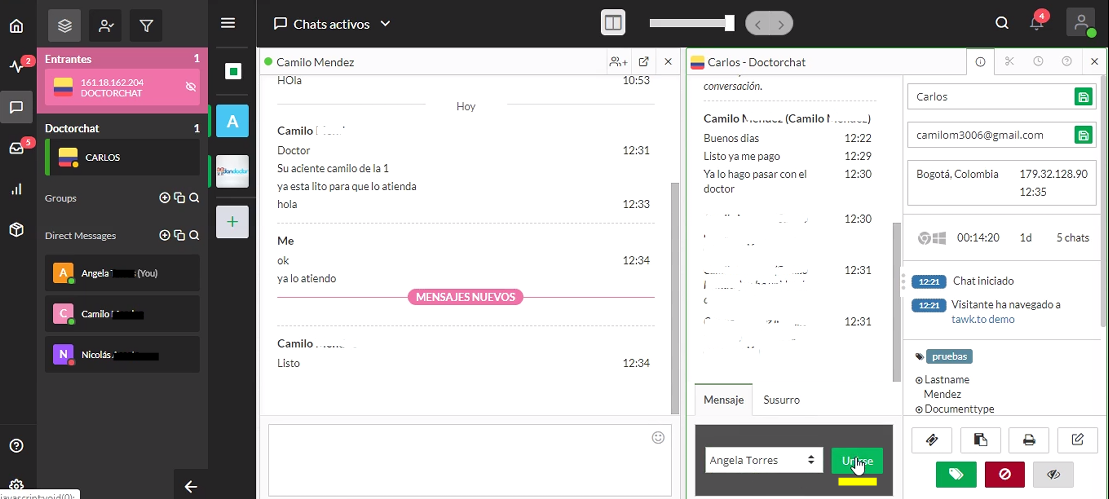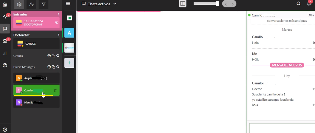 Debe dar clic en el chat del recepcionista, que aparecerá en verde en la banda izquierda de la pantalla. Enseguida, el chat aparecerá en la pantalla. (ver imagen 1)