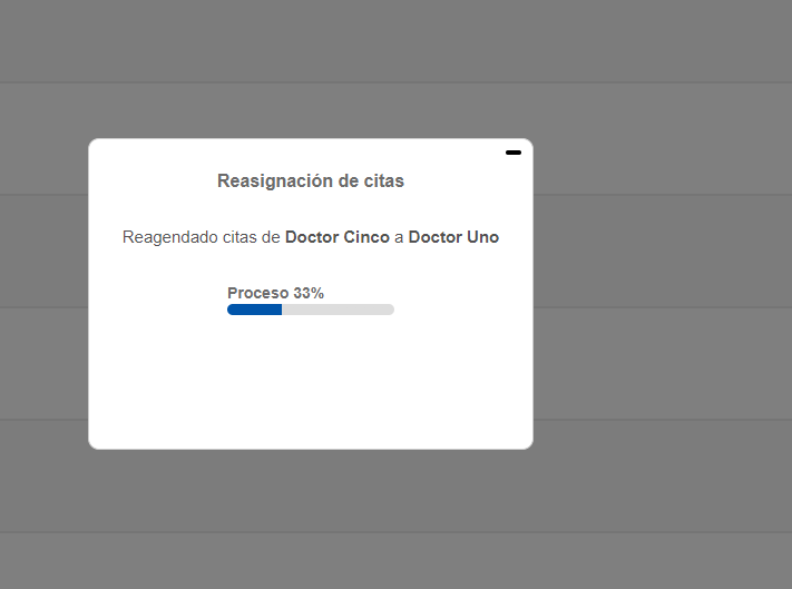 5. Al hacer clic en “Reasignar citas” el sistema abre una modal con una barra de progreso indicando el porcentaje de avance. buscando en el sistema los doctores que tengan agenda creada. (Como se ve en la imagen 6)