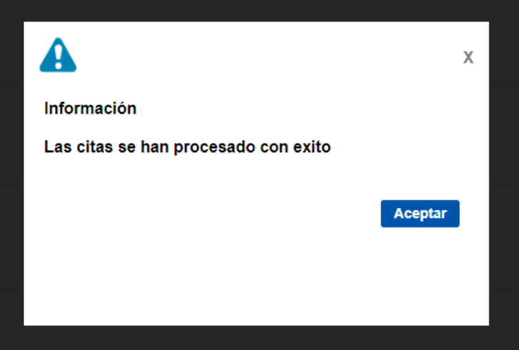 11. Una vez finalizado el proceso, en caso en que todas las citas sean reasignadas con éxito se mostrará un mensaje informando del éxito del proceso. (Como se ve en la imagen 12)