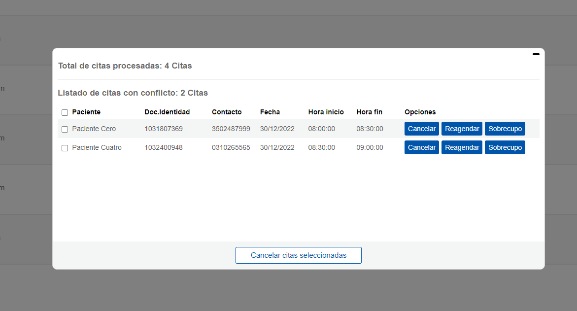 Nota: Se tiene la opción de cancelarlas todas, cancelarlas una a una, re-agendarlas una a una, o re-agendarlas como un sobrecupo.