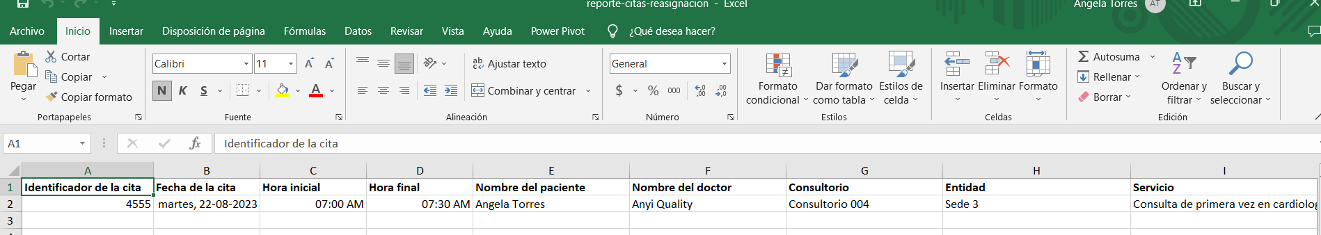 15. Al dar clic en el boton Ver citas automaticamente se va a descargar un excel (Como se ve en la imagen 16) En esta pantalla se puede ver el listado de reasignaciones realizadas, la fecha de creación, el nombre del creador, el doctor origen, el doctor destino, la razón del re-agendamiento, a adicional a ello se puede exportar un Excel con la información de las citas que se procesaron.