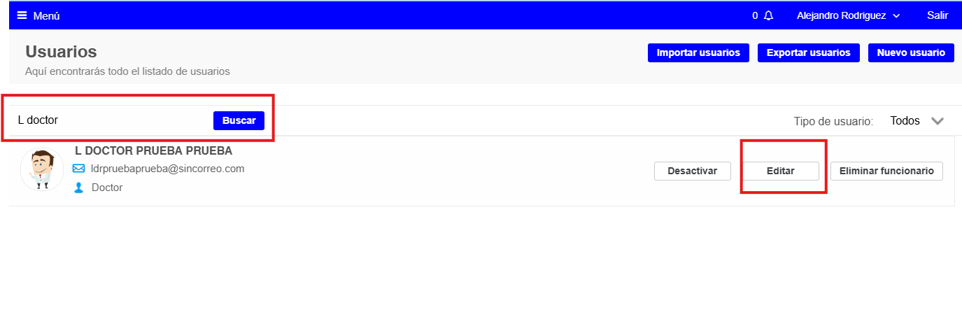 3. Vas a realizar la búsqueda del doctor por el nombre, la idea es tener en cuenta esta información para filtrar entre todos los usuarios que registran activos, una vez encuentras al doctor vas a dar clic en la opción de "Editar". (Como se ve en la imagen 4)