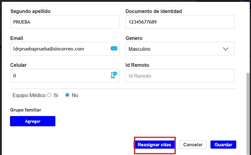 4. una vez se ingresa a la opción de "editar" , da clic en reasignar citas en la parte baja del formulario. (Como se ve en la imagen 5)