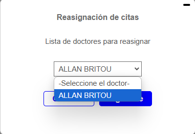 8. Si se selecciona reasignación total, carga una pantalla para que el usuario pueda seleccionar el doctor al cual va a reasignar todas las citas activas. (Tener en cuenta que para reasignar citas a otro doctor, ese doctor debe tener agenda para los mismos días y fechas que vamos a reasignar). (Como se ve en la imagen 9)