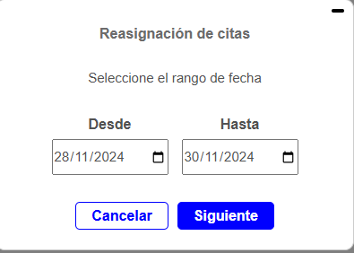 12. En caso en que el usuario seleccione como tipo de reasignación la opción “Reasignación por fechas” se desplegara una ventana en la cual debe seleccionar un rango de fechas para que pueda hacer la búsqueda de las citas activas. El sistema válida que la fecha inicial sea menor o igual a la fecha final, y también válida que en el rango seleccionado existan citas activas para reprogramar. (Como se ve en la imagen 13)