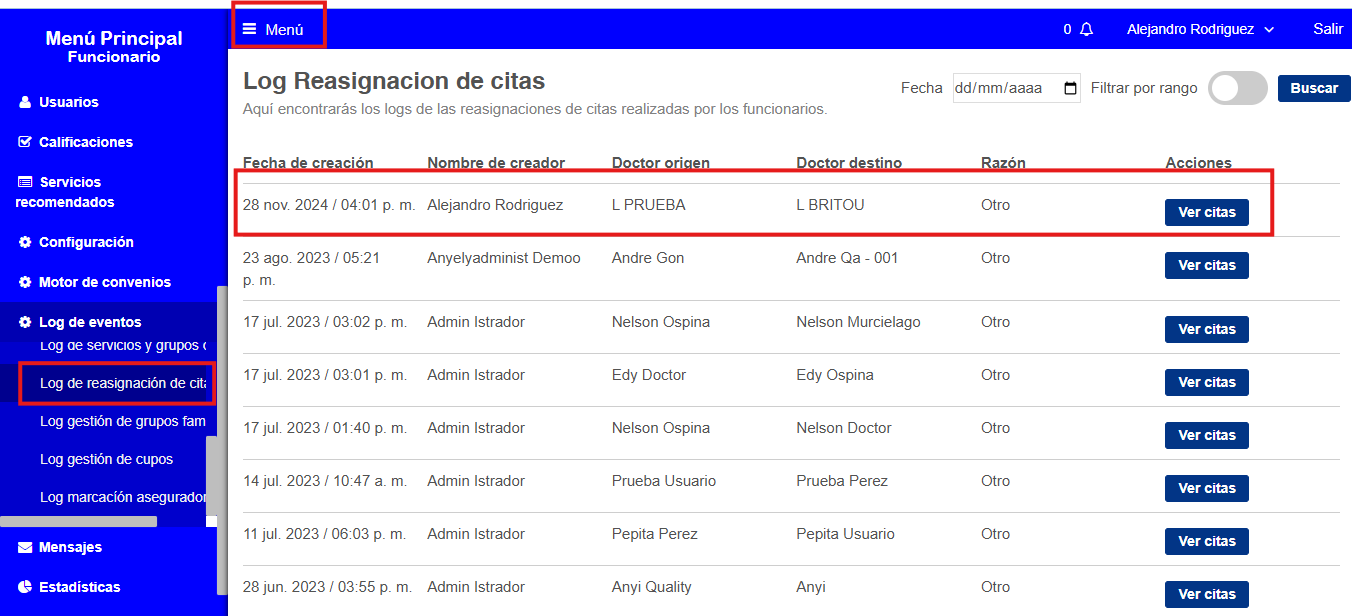 14. Para identificar quién realizo la reasignación de citas, creamos un Módulo para ver el Log de reasignaciones de citas. Ingresando al módulo “Log de reasignación de citas”. (Como se ve en la imagen 15)