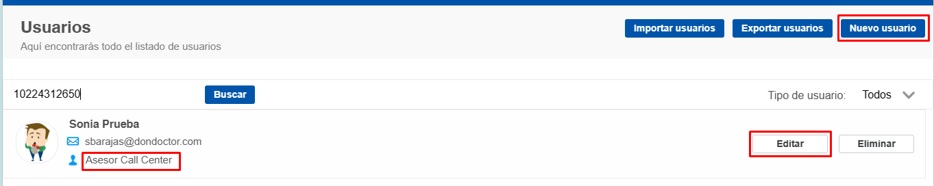 3. Selecciona el usuario que ya se encuentra creado con rol "Asesor Call Center" o crea un nuevo usuario con el rol previamente indicado: