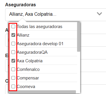 5. Al seleccionar el campo se desplegará una lista con las aseguradoras que actualmente se encuentran activas en el agendador, cada aseguradora tendrá una casilla tipo check, la/las aseguradoras seleccionadas serán las que ese asesor podrá gestionar.