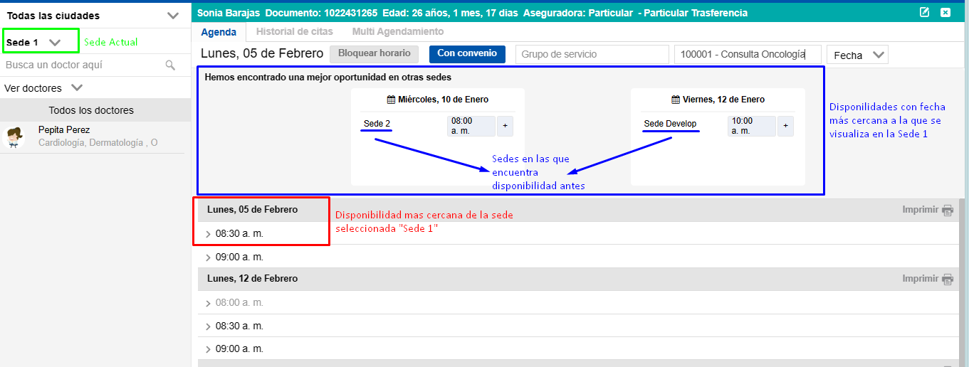 Si la plataforma identifica que en otras sedes hay disponibilidad más cercana para el mismo servicio te va a mostrar un cuadro con varias de esas disponibilidades como sugerencia, con el fin de que si es posible le indiques al paciente si desea tomar esa otra disponibilidad.