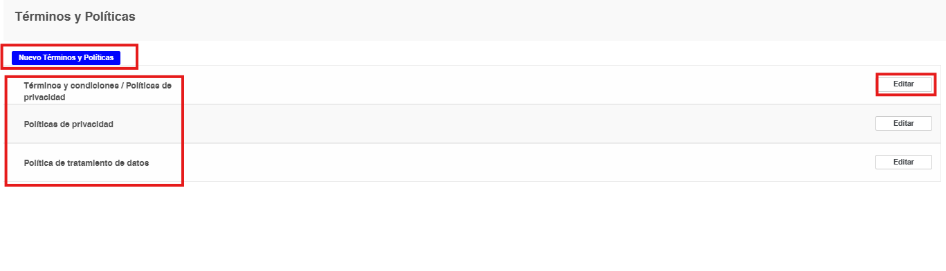 - una vez ingresamos al módulo de términos y políticas no encontramos con un listado de políticas que están implementadas, un botón para nuevos términos y políticas y por último un botón para editar las ya existentes