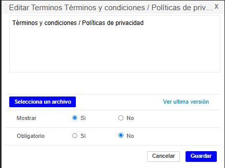 - Editar: al dar clic en esta opción nos permite editar los términos y políticas ya existentes, dando opciones adicionales como selección, archivos, ver última versión, y dos botones seleccionables para hacer que sea visible la política (mostrar) y para que sea obligatoria (obligatorio).