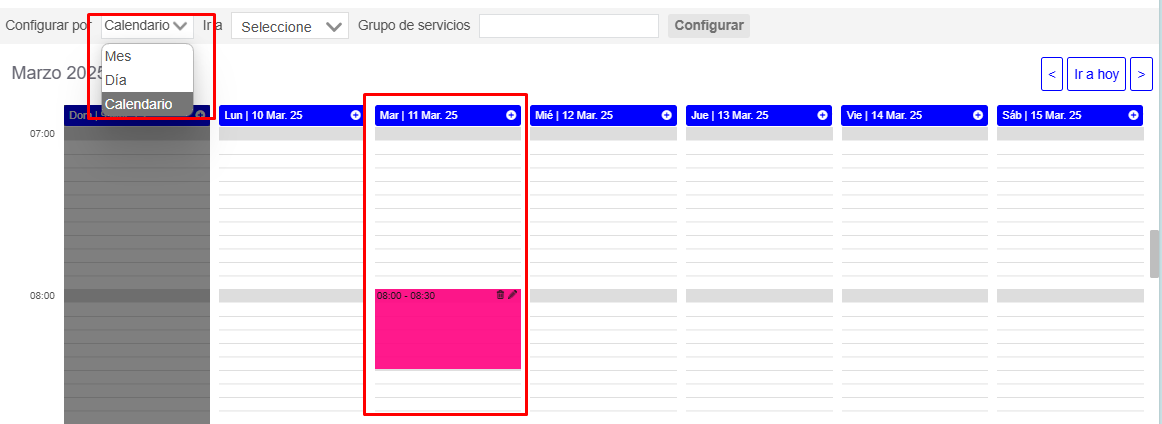 Debes seleccionar la forma en que quieres visualizar los espacios creados (mensual o día/calendario) y te mostrará la agenda creada: