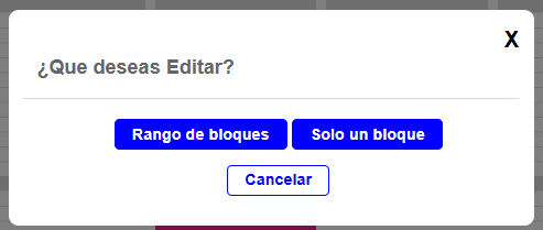 Al realizar cualquier acción te mostrará un mensaje indicando si solo deseas modificar ese bloque específico (en esa fecha y hora determinada) o el rango de bloques en general cuando identifique que existen más bloques creados de forma mensual: