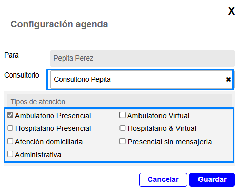 - Modificar agendas creadas para cambiar el tipo atención (presencial, virtual...) o el consultorio