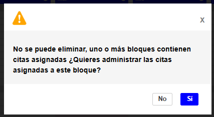 En el proceso de eliminación, si identifica citas agendadas en ese bloque indicará una alerta con esa información para que gestiones las citas (Si) o canceles el proceso de eliminación (No)