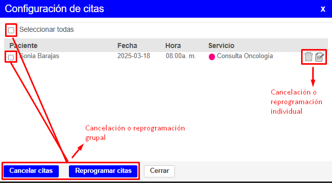Al dar clic en el botón "Si", listará las citas agendadas para que realices el proceso de reprogramación (individual o grupal) y cancelación (individual o grupal)
