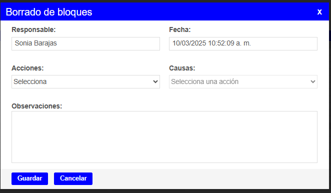 Por último, visualizaras un pop up para indicar el motivo de la cancelación y finalizar el proceso de eliminación:
