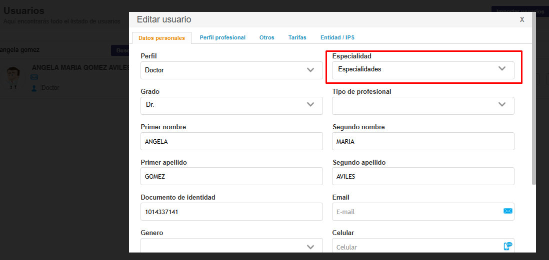 - Una vez el proceso de integración automática cree el profesional y los espacios al día siguiente, el equipo de Chía (funcionarios con rol Maestro), deben ingresar al módulo de Usuarios y asociarle la/s especialidad/es al profesional para que se visualicen los espacios correspondientes. Si no se realiza ese proceso no van a visualizar los espacios para gestionar las citas.